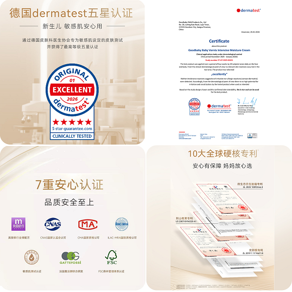 严苛品控与权威背书,是好孩子坚守安全承诺的硬核底气。全新微生态仿生胎脂系列,一举斩获德国Dermatest 五星最高等级认证——该认证由德国百年专业皮肤测试机构颁发,是全球皮肤安全领域的权威标杆,五星为该体系最高评级,代表极致温和、极低刺激、新生儿与敏弱肌均可安心使用。