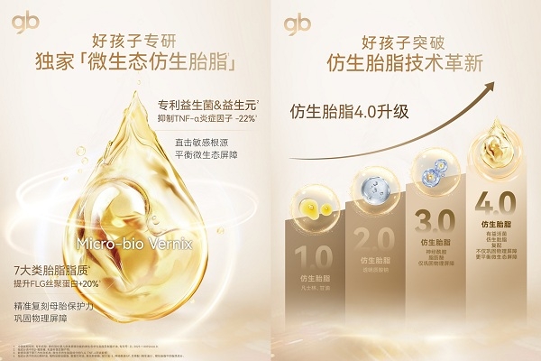 好孩子经过多年探索,研制出独家专利“微生态仿生胎脂”,完成仿生胎脂4.0的重大技术革新。重点强化双重屏障防护能力,实现婴童敏感肌的修护技术突破。