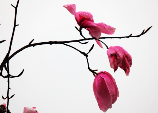 5、辛夷的花瓣常“外紫而内白”,既不像白玉兰的几乎都是白,也不像紫玉兰的都是紫红。