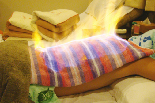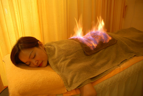 2.温经散寒。火疗通过酒精燃烧逐渐加温,使热力达到体内,涂抹火龙液后按摩使药力到达病所,温通经脉,散寒除湿。