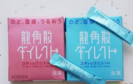 日本神药龙角散,蓝色薄荷味,粉色蜜桃味。龙角散在日本可谓家喻户晓,有200多年的历史,对嗓子不适,吸烟过多,感冒引起的喉咙肿痛,咳嗽不止均有明显的缓和作用。薄荷味、蜜桃味为粉末状。可直接对着患处倒入,入口即化,见效快。最主要味道甜甜的,凉凉的。全部中草药成分