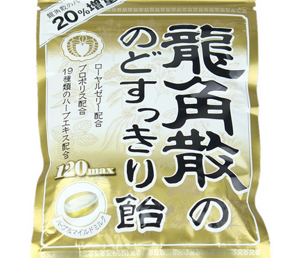 咳嗽痰多怎么办?咽喉肿痛怎么办?喉咙干涩怎么办?干咳不断怎么办?一粒龙角散润喉糖能够轻松搞定。龙角散已经有200年的历史,作为藤井家的家传秘方传承下来。龙角散润喉糖在龙角散粉末的外层包了含有19种中药提取物的糖衣,使嗓子得到清爽,第二次,糖中心的龙角散草本粉末也开始起作用,清爽的感觉更加持久。
