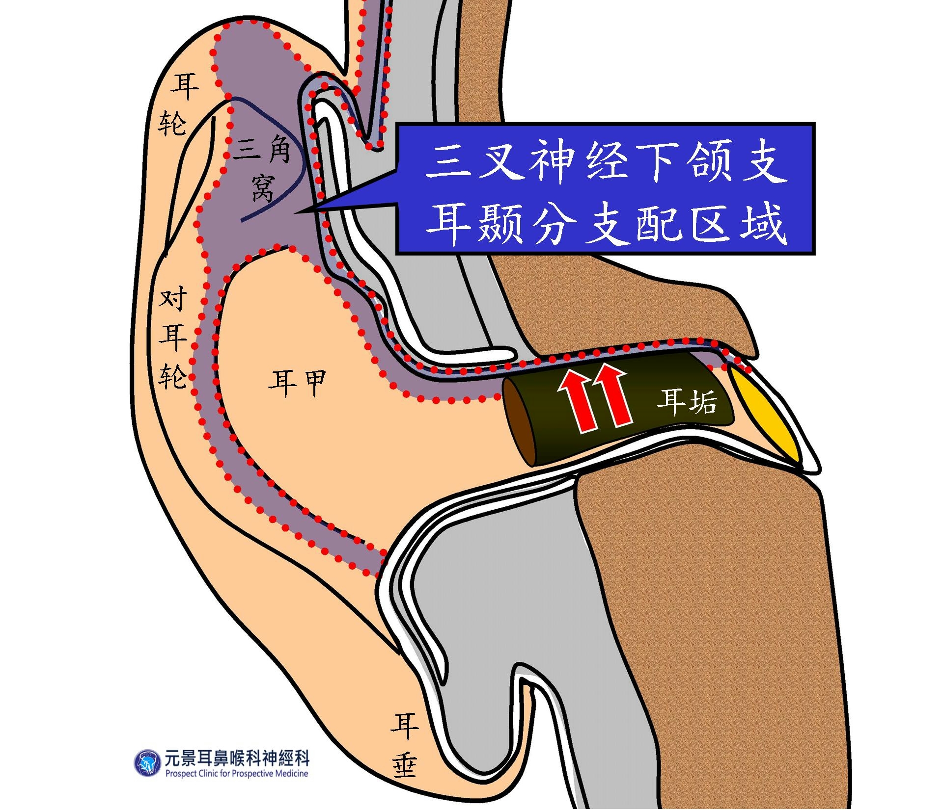 图说:耳垢栓塞会刺激三叉神经下颌支之耳颞分支,诱发偏头痛。