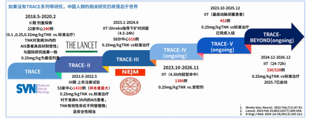 在“跟跑”到“领跑”的历程中,由北京天坛医院王拥军教授发起的TRACE系列研究颇具代表性。TRACE系列研究从2018年起在我国开展,主要目的是探寻我国自主研发的第三代溶栓药物——中国替奈普酶(rhTNK-tPA)在中国缺血性卒中患者中的安全性和有效性。TRACE系列研究从最初的剂量探索性研究,不断结合临床未满足的治疗需求,丰富研究版图,截至2025年7月,已开展了6项研究,其中TRACE、TRACE-2和TRACE-3研究已顺利完成并取得令人瞩目的成果,TRACE-4、TRACE-5和TRACE-BEYOND研究正在进行中,结果预计将在近几年出炉(图1)。TRACE系列研究的开展不仅让中国人群相关研究领先于世界,也为卒中再灌注治疗带来了中国方案。这也标志着,中国首个替奈普酶开启了再灌注治疗的黄金时代。