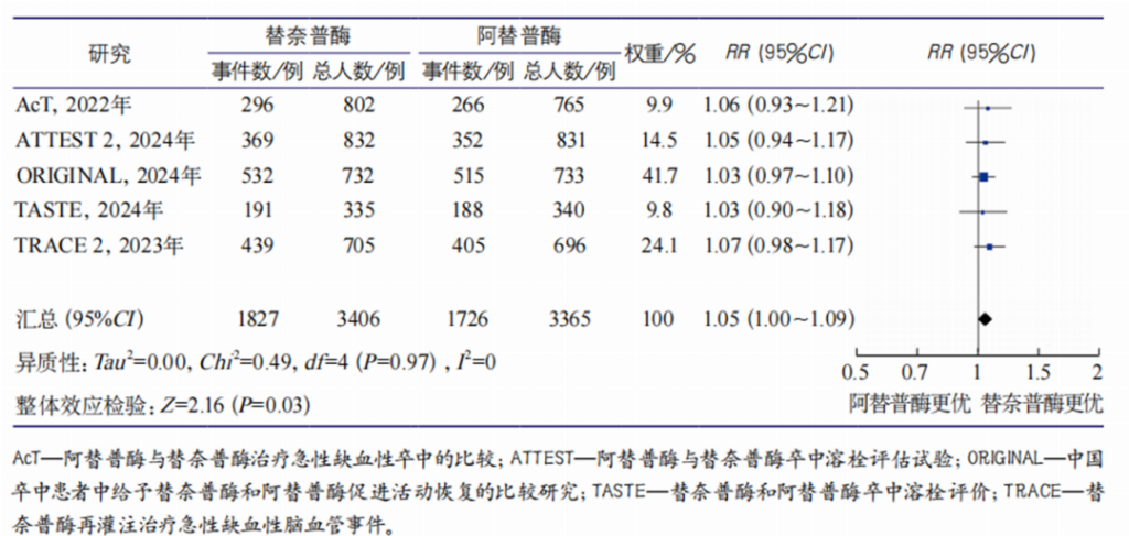 另外一项纳入11项随机对照试验的荟萃分析,同样显示,与阿替普酶相比,替奈普酶与更高的良好功能预后可能性显著相关(RR 1.05,95%CI 1.01-1.10,P=0.012),且3个月时的残疾程度更低(cOR 1.10,95%CI 1.01-1.19,P=0.034),两组症状性颅内出血发生率、3个月死亡率相似5。