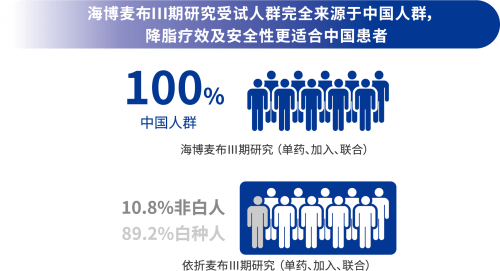 海博麦布的 III 期临床研究(涵盖单药、加入、联合等用药方式),受试人群 100% 来源于中国人群[4](而依折麦布 III 期研究中仅 10.8% 为非白种人,89.2% 为白种人[6,7,8])。这意味着海博麦布的疗效及安全性数据是在中国患者的实际临床场景中获取的,能够更精准地反映中国血脂异常患者使用该药物的真实情况,为临床医生制定治疗方案提供了更具针对性的依据。