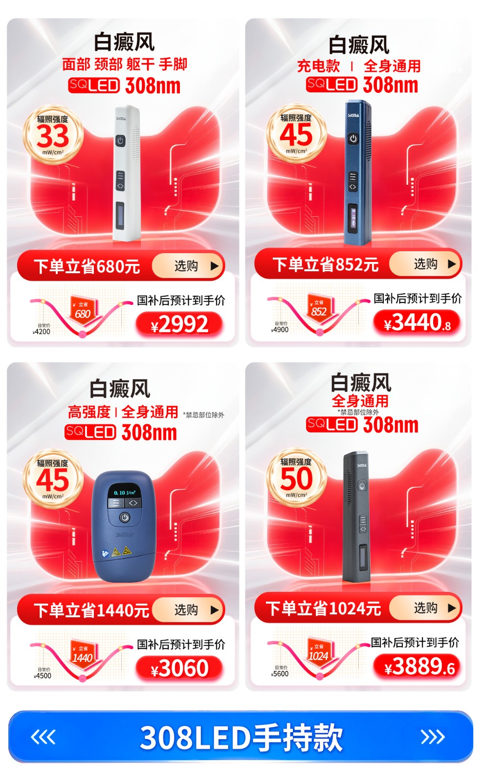 公司主要产品是医疗机构使用的大型专业设备,不断的更新迭代,我们的产品有全身大型光疗仪,日光模拟器,红蓝黄光动力,皮肤检查灯等,满足了医院皮肤科多病种,多层次的光疗需求。基于专业大型设备的产品使用经验,我们也同步研发出适合家用的产品,主要有311nm灯管型、SQLED308光疗仪,308准分子氯化氙紫外线光疗仪适用于白癜风银屑病的居家治疗,现在受到广大客户的欢迎,并且我们也不断更新产品线,把控产品质量,在2025年,我们公司推出的60mw强度SQLED308产品系列,能针对手脚顽固白癜风达到理想复色。